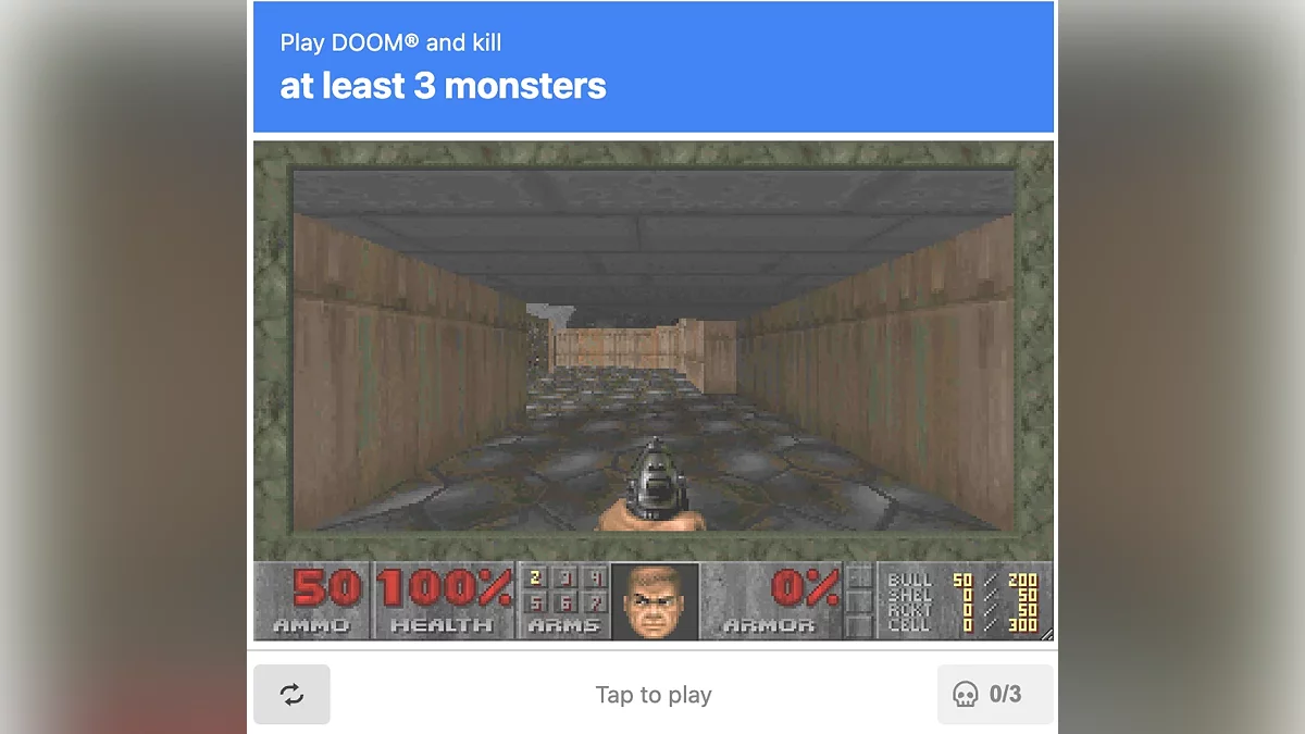 Тест CAPTCHA, который обычно раздражает пользователей необходимостью распознавать искажённые символы или искать велосипеды на изображениях, получил новую форму. Теперь, чтобы доказать, что вы — не робот, достаточно убить трёх монстров в легендарной игре Doom.
