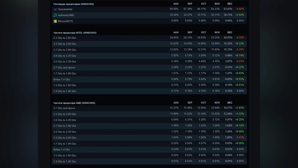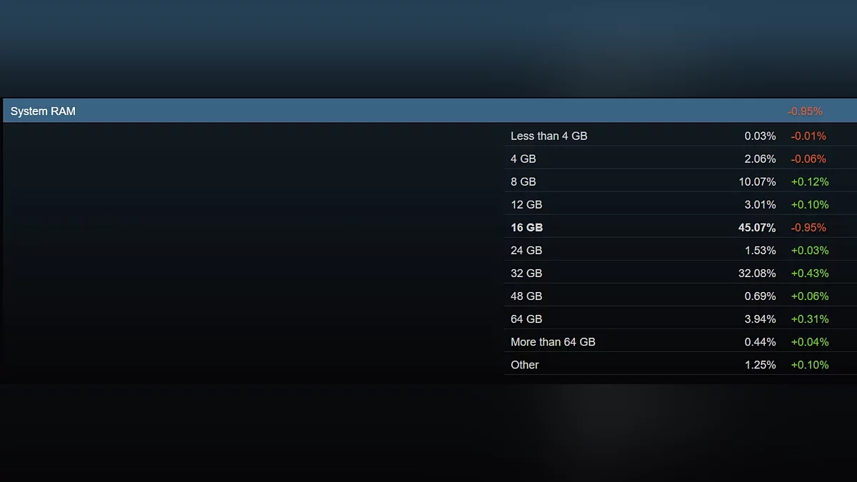 Согласно данным, доля пользователей, устанавливающих на свои ПК 64 Гб оперативной памяти, увеличилась до 3,94%, хотя большая часть всё ещё выбирает 16 Гбайт, с незначительным снижением до 45,07%. Более популярными становятся также 32 Гб (32,08%). Процессоры AMD Ryzen продолжают набирать популярность: в декабре их доля составила 38,73%, в то время как Intel по-прежнему лидирует с показателем 63,43%.