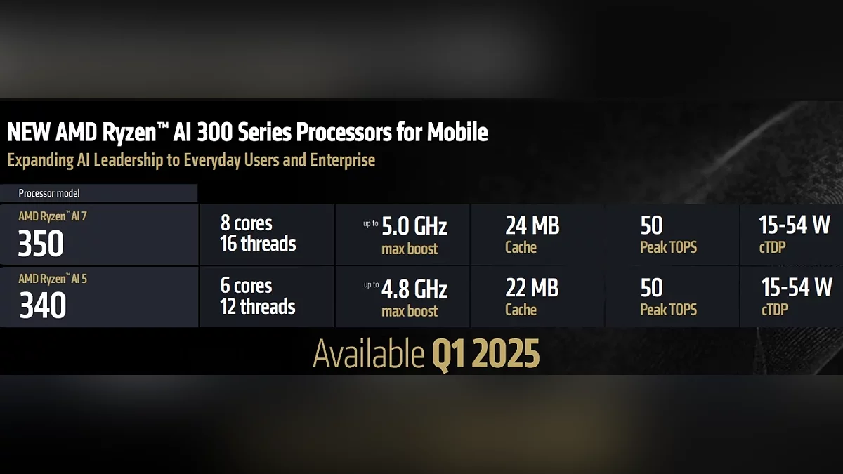 Серия Ryzen AI 300 включает процессоры с архитектурой Zen 5 и Zen 5c. Модели Ryzen AI 7 350 и Ryzen AI 5 340 дополнили старшие чипы Ryzen AI 9 370 и Ryzen AI 9 365, представленные ранее.