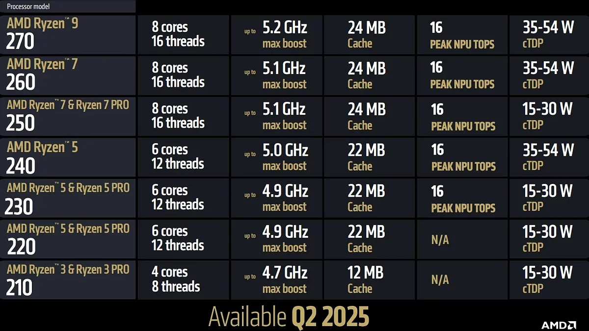 Серия Ryzen 200, в свою очередь, базируется на более старой архитектуре Hawk Point с ядрами Zen 4. Эти процессоры фактически являются переименованными моделями Ryzen 8000. Например, Ryzen 9 270 идентичен Ryzen 9 8945HS. Основными особенностями обновленной линейки являются: