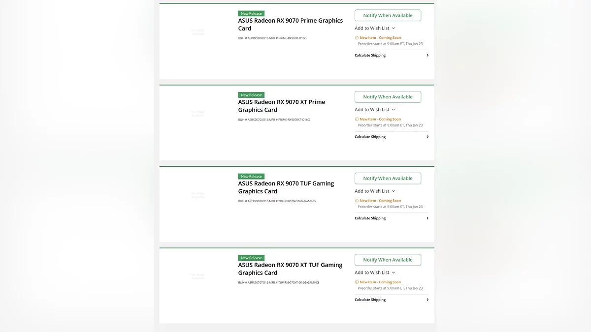 Американский ритейлер B&H анонсировал начало предзаказов на новые видеокарты Radeon RX 9070, которые должны стартовать 23 января. Это дата предполагаемого начала продаж, хотя точная информация о релизе от AMD пока не была официально подтверждена. Предзаказы будут доступны на модели от ASUS, включая варианты как с XT, так и без этой приставки, PowerColor и ASRock.
