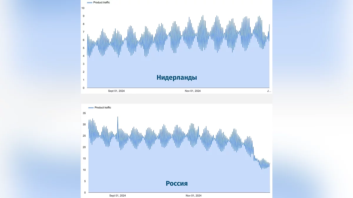 Основной причиной такого скачка стало использование сервисов для обхода блокировок, чьи серверы расположены преимущественно в Европе. В частности, в Нидерландах наблюдается особенно бурный рост, что для страны с 18 миллионами жителей является серьезным изменением. В это же время, в России наблюдается резкое сокращение трафика на 64%, как для десктопной версии, так и для мобильной.