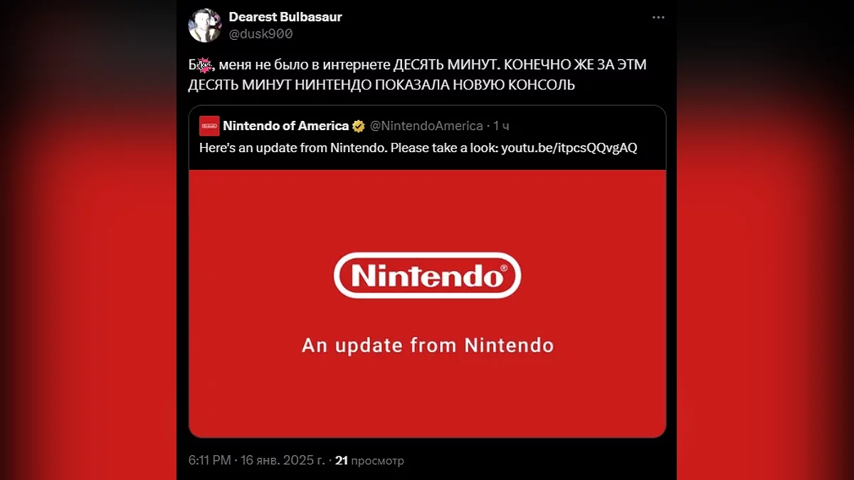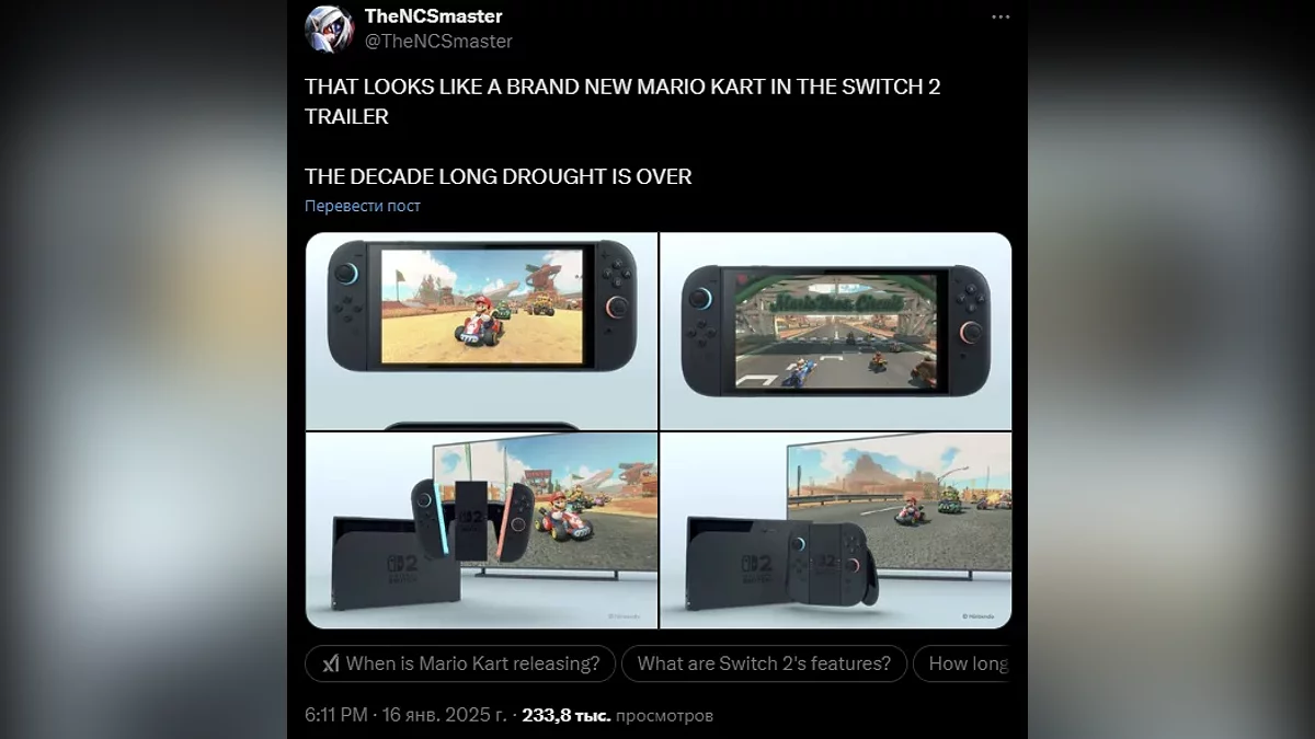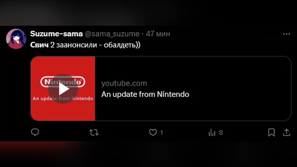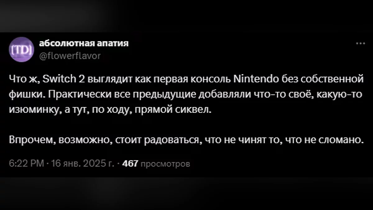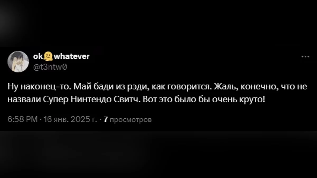 Анонс Nintendo Switch 2 оказался настоящим хитом: официальный ролик уже набрал миллионы просмотров, а тег Switch 2 стал одним из самых обсуждаемых в соцсети X. Западная аудитория осталась в полном восторге, оценив и обновлённый дизайн, и новую игру про Марио. Опасения вызвали только джойконы — первая Switch печально известна дрифтом стиков.