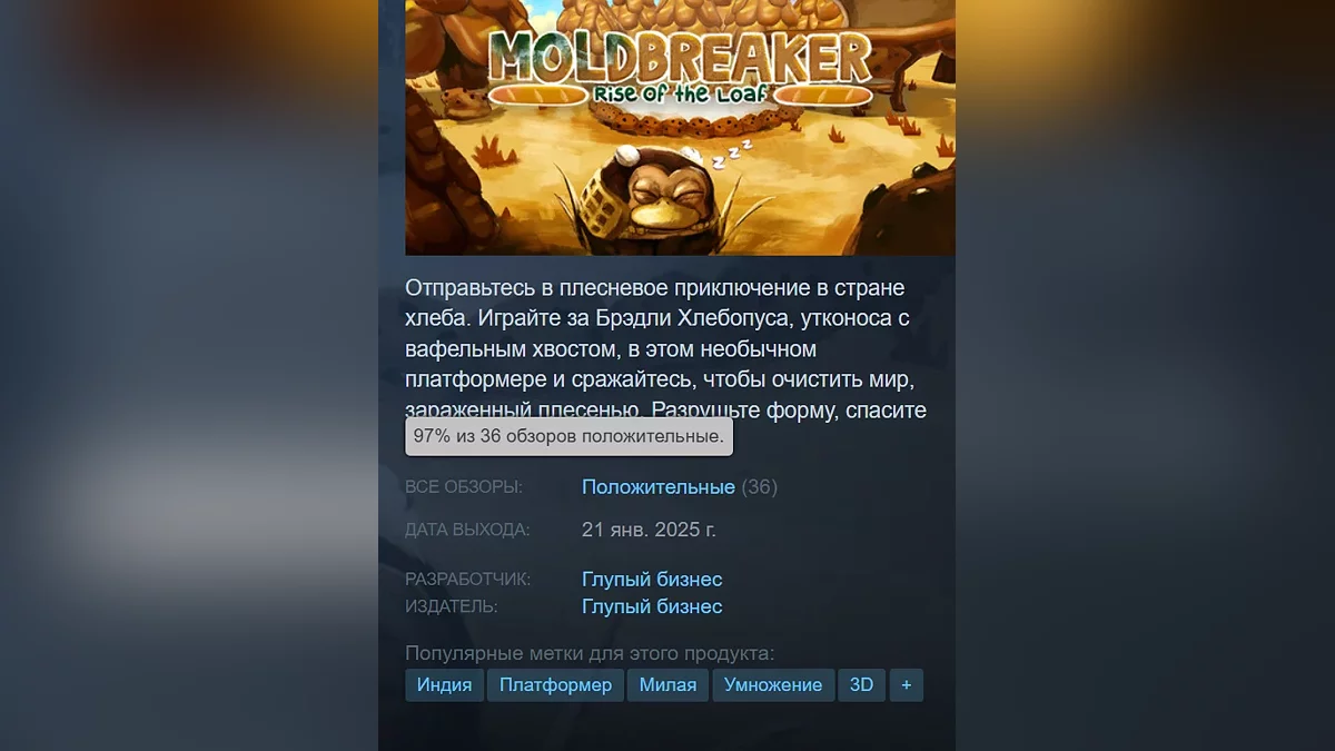 Moldbreaker: Rise of the Loaf — 3D-платформер про хлебное королевство, которое нужно спасти от плесени. Игра состоит из 3 уровней. Имеет 97% положительных отзывов. Страница в Steam.