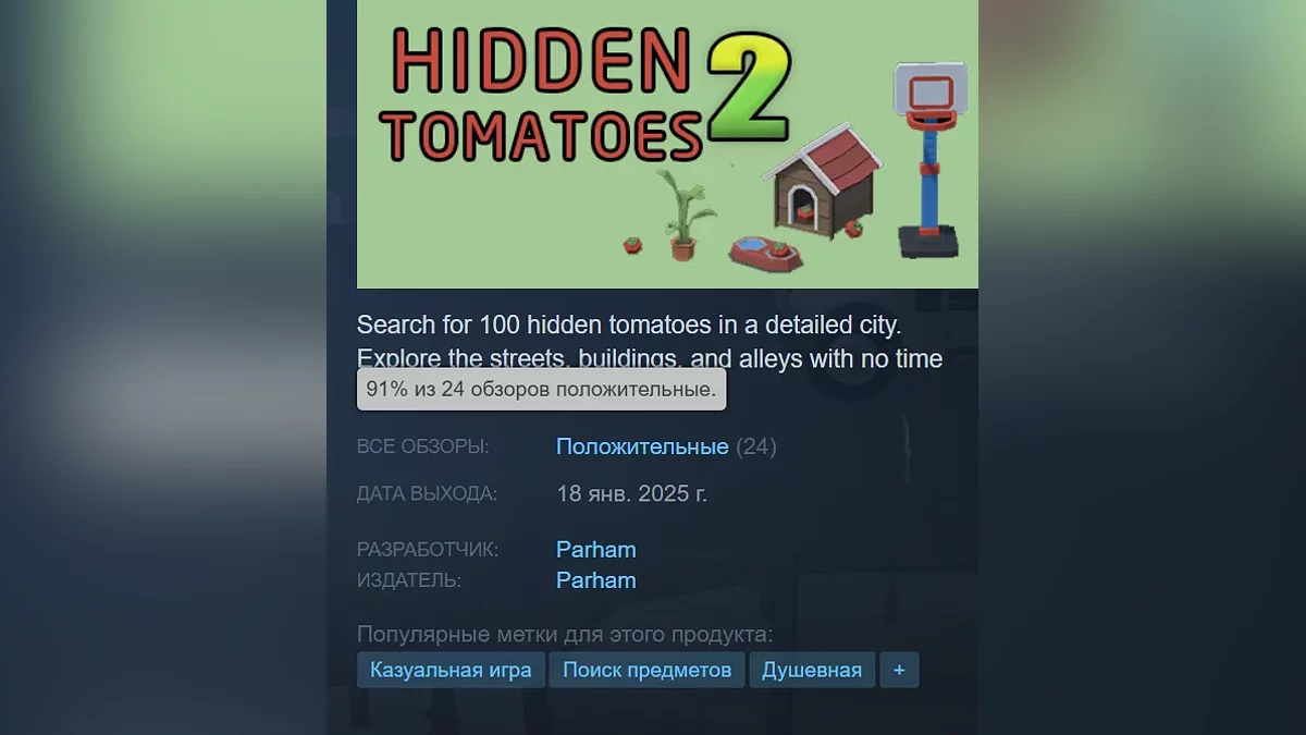 Hidden Tomatoes 2 — игра про поиск предметов. В игре есть один городской уровень, где нужно отыскать 100 помидоров. Проект получил 91% положительных отзывов. Страница в Steam.