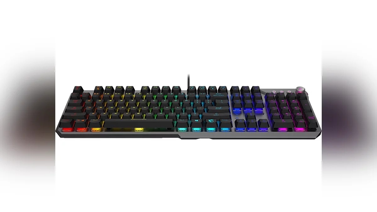 Клавиатура выполнена в полноразмерном формате с 104 клавишами и дополнительными мультимедийными элементами, включая колесо регулировки громкости. Верхняя панель корпуса из алюминиевого сплава придаёт устройству прочность и современный внешний вид, а регулируемые ножки и эргономичный профиль обеспечивают удобство использования.