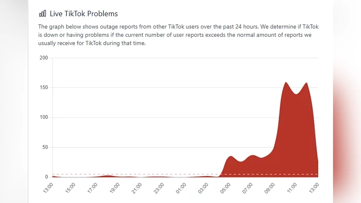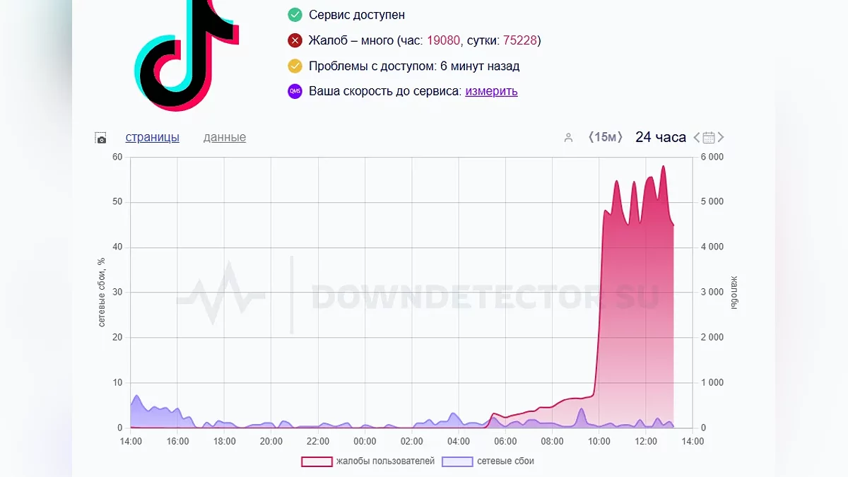 Судя по отчётам, TikTok «лёг» около 5:00 по мск. В основном у пользователей не загружаются медиа, а некоторые не могут зайти в личный кабинет, в приложение или даже на сайт. Основной пик сообщений пришёлся на 12:45 — тогда на сбой пожаловались почти 6 тысяч пользователей. Сейчас количество жалоб снижается как в России, так и за рубежом.