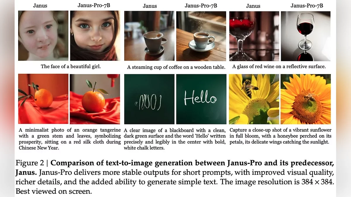 Китайская компания DeepSeek представила новую мультимодальную нейросеть Janus-Pro-7B, предназначенную для эффективного распознавания и генерации изображений. В сравнении с предыдущими версиями, новая модель значительно улучшена: оптимизированы алгоритмы обучения, расширен датасет и увеличен размер самой модели. Эти изменения позволили нейросети значительно улучшить результаты в задачах, связанных с генерацией изображений по текстовым описаниям и их анализом.