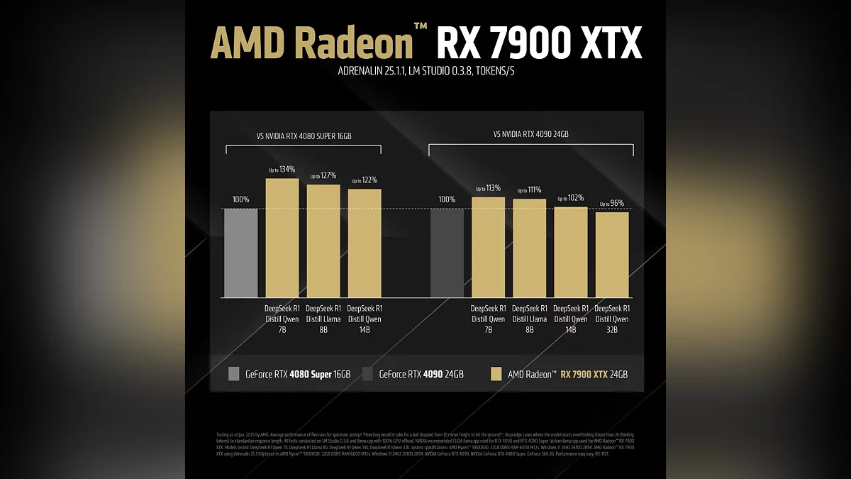 AMD заявила, что её видеокарта Radeon RX 7900 XTX демонстрирует более высокую производительность в задачах искусственного интеллекта по сравнению с GeForce RTX 4090 и RTX 4080 Super. В тестах с языковой моделью DeepSeek R1 видеокарта на архитектуре RDNA 3 обошла конкурентов в ряде сценариев.