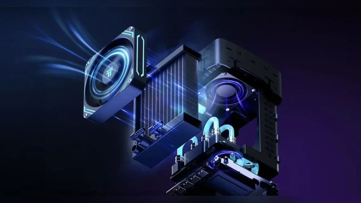 Главная особенность новинки — гибридная система охлаждения, объединяющая жидкостный контур, медный радиатор (6888 мм²) и два вентилятора, что обеспечивает рассеивание до 250 Вт тепла при уровне шума ниже 36 дБ. Это позволило уместить в алюминиевый корпус размером 25,5×15×15 см (объём 5,7 л) топовые компоненты: процессоры Intel Core i7-13620H или i9-13900H, видеокарту NVIDIA RTX 4060 с 8 Гб GDDR6, до 64 Гб DDR5 RAM и SSD до 2 Тб (PCIe 4.0).