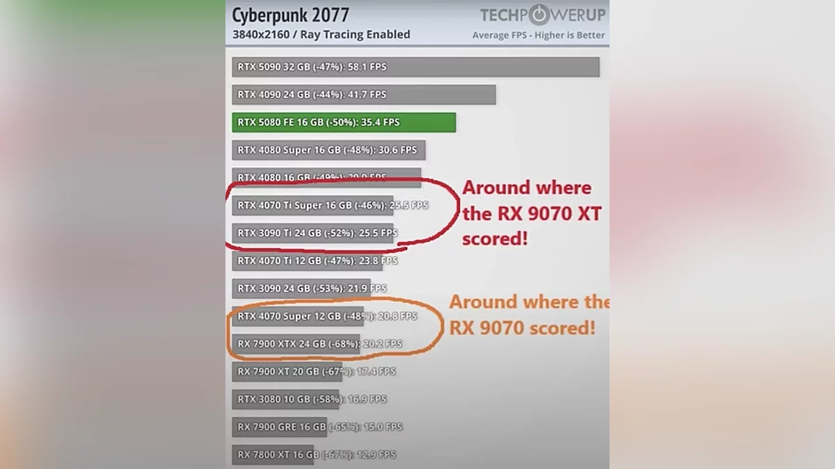 Аналитики отмечают, что NVIDIA, сосредоточившись на эволюции RTX 5080 (которая, по слухам, оказалась лишь на 8-16% быстрее RTX 4080 Super), рискует уступить средний ценовой сегмент. Младшие модели RX 9070, как ожидается, обойдут RTX 5070 на 12%, создав давление на NVIDIA в среднем ценовом диапазоне. Хотя AMD традиционно отстает в трассировке лучей, RX 9070 XT демонстрирует неожиданные результаты. В тестах Cyberpunk 2077 в 4K с ультра-настройками RT карта занимает позицию между RTX 4070 Ti Super и легендарной RTX 3090 Ti.