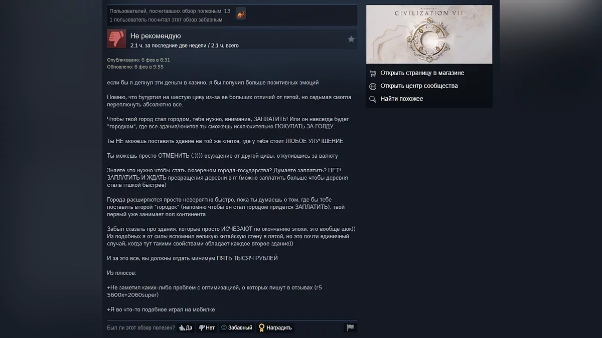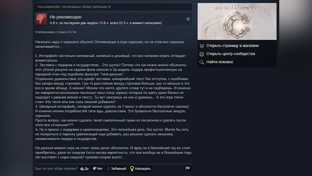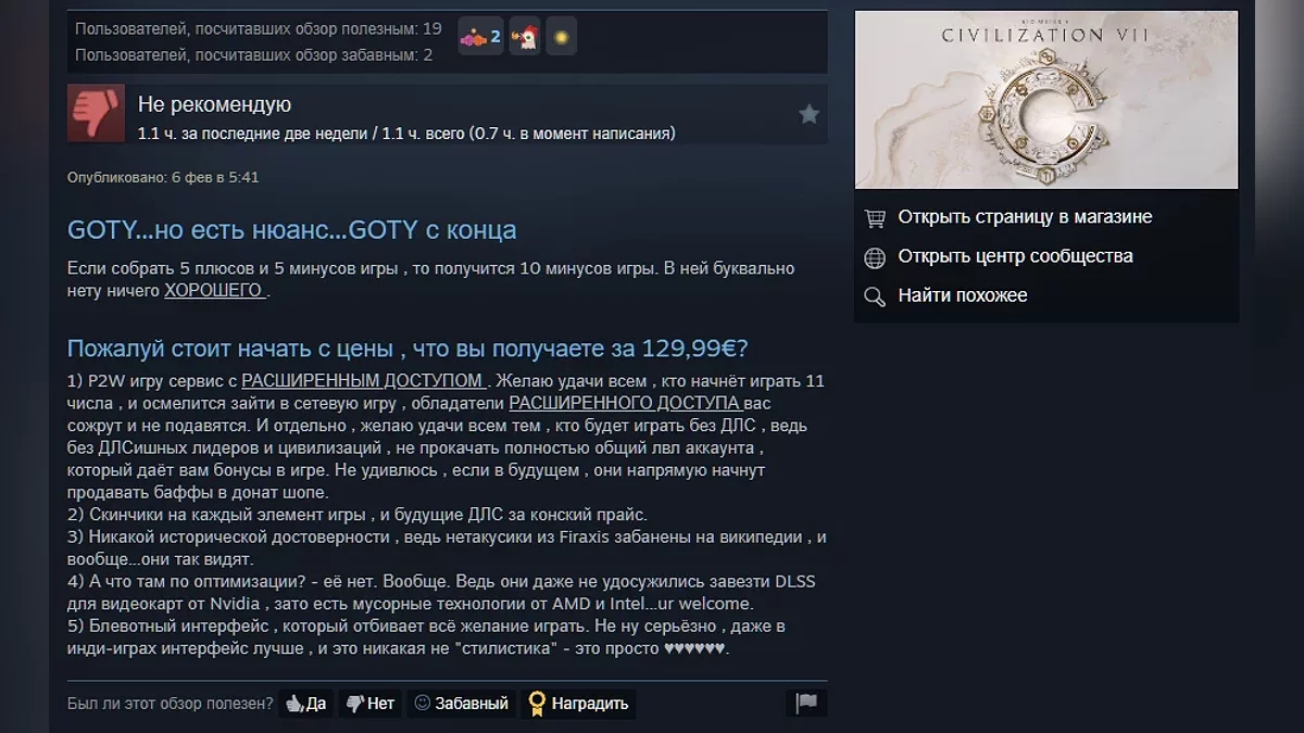 6 февраля состоялся ранний запуск Sid Meier's Civilization 7 — игра доступна владельцам делюксовых и более дорогих изданий. Как и предупреждали критики, новая часть получилась неоднозначной: в Steam у неё пока всего 39% положительных отзывов.