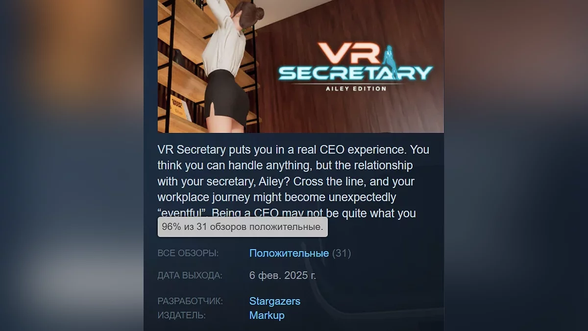 VR Secretary: Ailey Edition — VR-игра, где геймерам в роли генерального директора нужно взаимодействовать с секретаршей. Имеет 96% положительных отзывов. Страница в Steam.