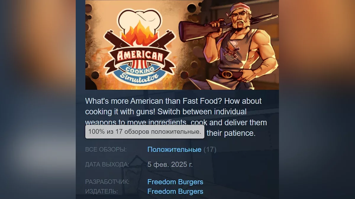 American Cooking Simulator — шутер про сотрудника заведения быстрого питания, где бургеры готовятся с использованием огнестрельного оружия. Имеет 100% рейтинга. Страница в Steam.