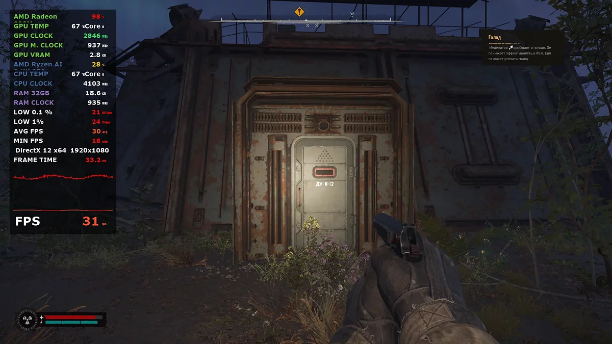 В тестах Cyberpunk 2077 на минимальных настройках и разрешении Full HD система выдала стабильные 60 кадров в секунду. В таких играх, как Spider-Man 2, Forza Horizon 5 и The Elder Scrolls V: Skyrim — Special Edition, удалось достичь комфортного уровня графики в разрешении 2K. Особого внимания заслуживает тестирование S.T.A.L.K.E.R. 2. Несмотря на оптимизационные патчи, игра остаётся требовательной к ресурсам. Однако с использованием технологии FSR (FidelityFX Super Resolution) удалось добиться 50 кадров в секунду, а с генерацией кадров — до 80, хотя и с некоторой потерей детализации.