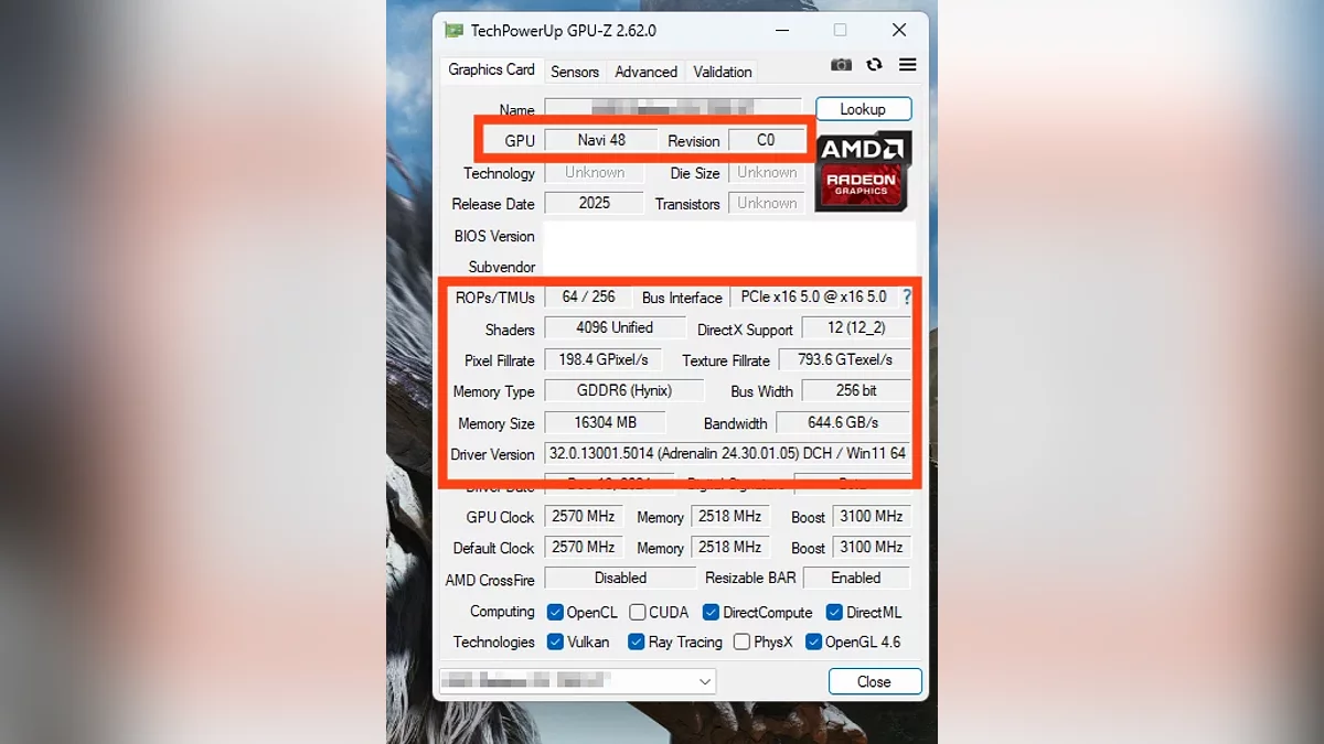 Неожиданная утечка от гонконгского издания HKEPC позволила оценить технические мощности RX 9070 XT, в сети появились скриншоты GPU-Z, демонстрирующие видеокарту. Согласно данным GPU-Z, карта использует графический процессор Navi 48 с рекордными параметрами: 4096 потоковых ядер, 256 текстурных и 64 растеризационных блока. Частоты варьируются от 2.57 ГГц в базе до 3.1 ГГц в режиме Boost — такой разброс намекает на агрессивный заводской разгон. 16 ГБ памяти GDDR6 с 256-битной шиной, обеспечивающей пропускную способность до 664.6 ГБ/с — это на 15% выше, чем у предыдущих моделей AMD.