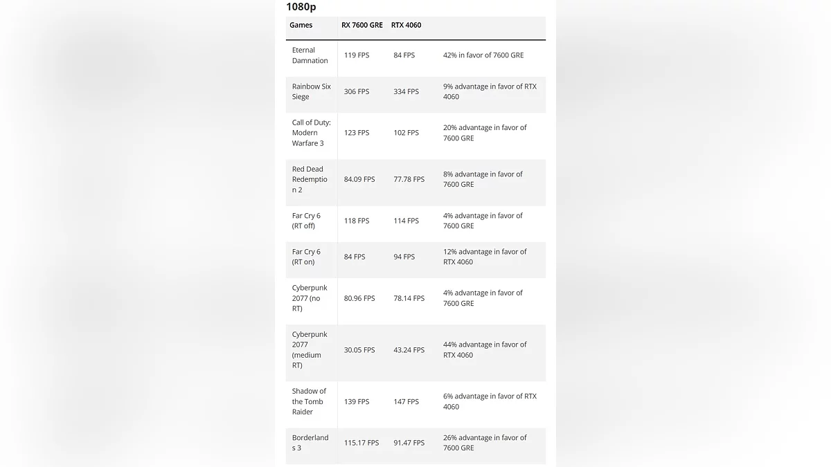 Лидерство AMD проявилось в проектах без трассировки лучей. В Eternal Damnation разрыв достиг 42% (119 vs 84 FPS), в Borderlands 3 — 26% (115 vs 91 FPS). Средний прирост по 8 играм составил 7%. Слабое звено Radeon — рендеринг лучей. В Cyberpunk 2077 с RT на средних настройках RTX 4060 оказался быстрее на 44% (43 vs 30 FPS), а в Far Cry 6 с включённой трассировкой — на 12%. При переходе на 1440p AMD сохранила преимущество, хотя разница сократилась. В 3DMark результаты также склонились в пользу RX 7650 GRE, что подчёркивает её потенциал в задачах, не связанных с RT. Однако в условиях роста популярности трассировки выбор может сместиться в сторону решений NVIDIA.