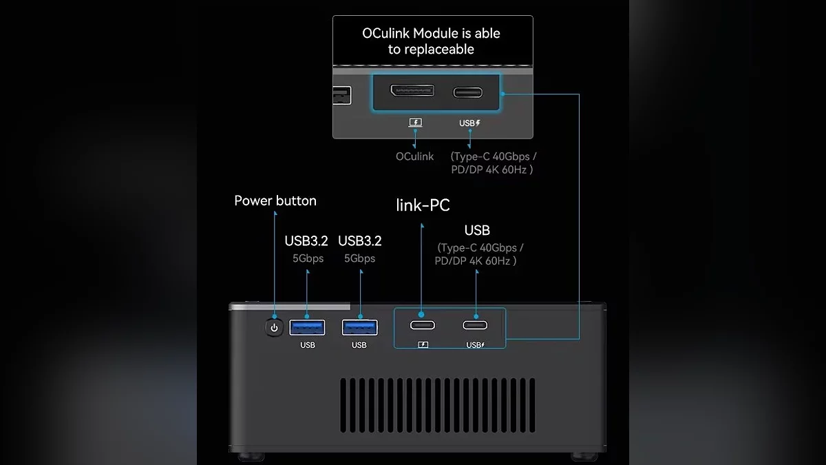 Главная фишка G1 — сменный блок интерфейсов, позволяющий адаптировать докстанцию под разные сценарии. Для максимальной производительности предусмотрен модуль с разъёмом OCuLink (PCIe 4.0 x4, до 64 Гбит/с) и USB-C с поддержкой зарядки 85 Вт. Если ПК не оснащён OCuLink, пользователи могут выбрать альтернативу с двумя USB-C портами. Это делает G1 универсальным решением для ноутбуков и мини-ПК, включая устройства без специализированных интерфейсов.