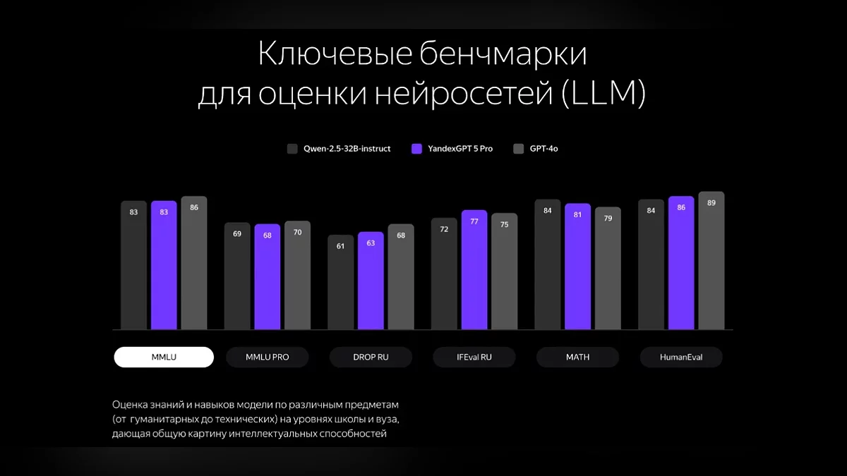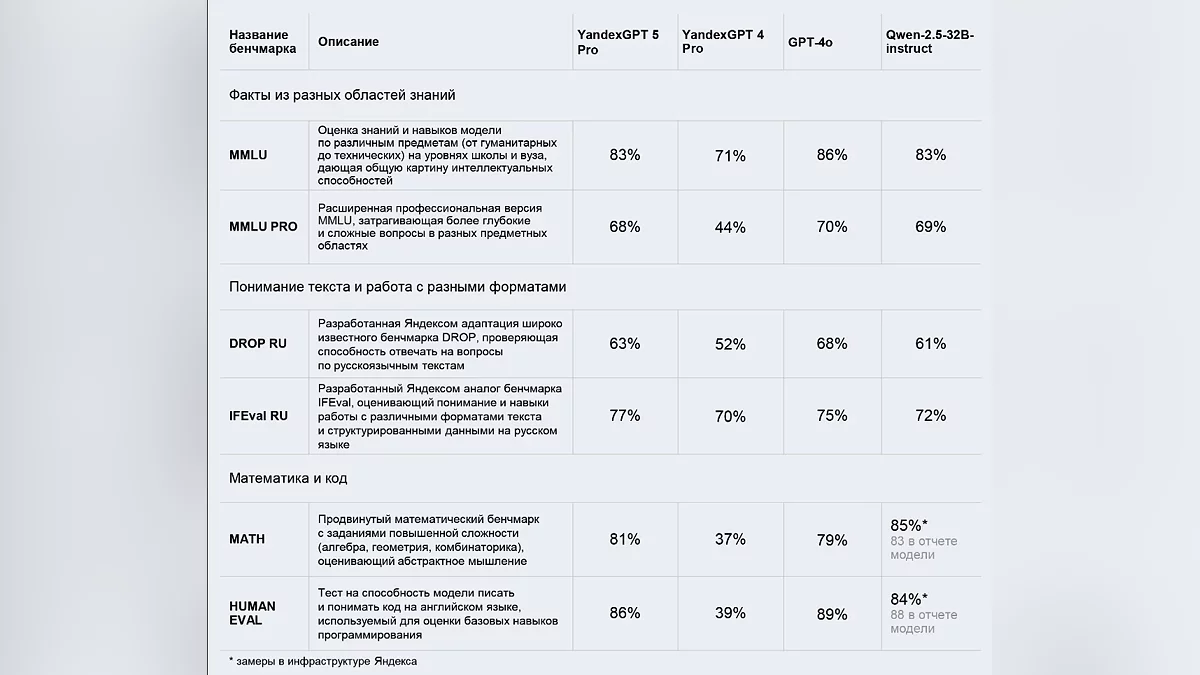 Согласно внутренним тестам Яндекса, YandexGPT 5 Pro в 64% случаев превосходит китайский аналог Qwen2.5, особенно в фактологической точности и соблюдении формата, слегка уступая лишь в математических расчетах. В слепых сравнениях с GPT-4o модель демонстрирует паритет, а в креативных заданиях — опережение. Яндекс временно снял ограничения, чтобы каждый мог оценить мощь YandexGPT 5 Pro. Для ценителей «чистого» ИИ в чате доступен режим без функций ассистента — здесь нейросеть отвечает исключительно на основе своих знаний.