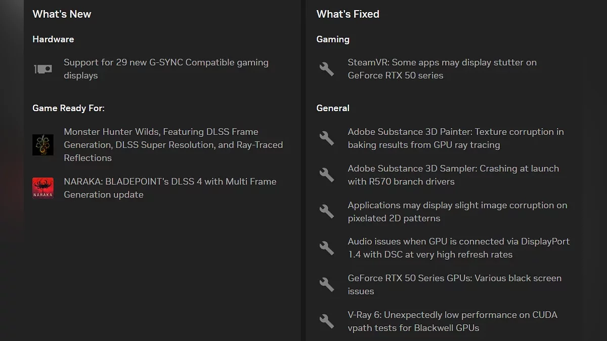 - Добавлена поддержка Monster Hunter Wilds с функциями DLSS Frame Generation, DLSS Super Resolution и Ray-Traced Reflections;