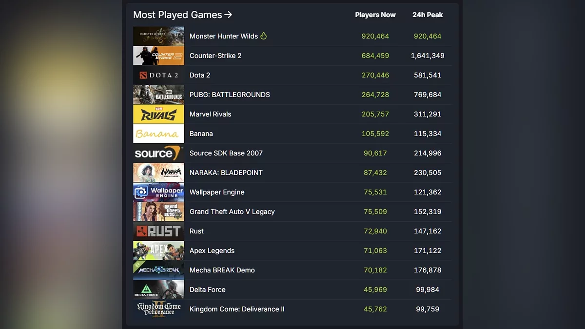 Monster Hunter Wilds вышла и сразу же собрала онлайн в 900 тыс. человек. Сейчас это самая популярная игра в Steam