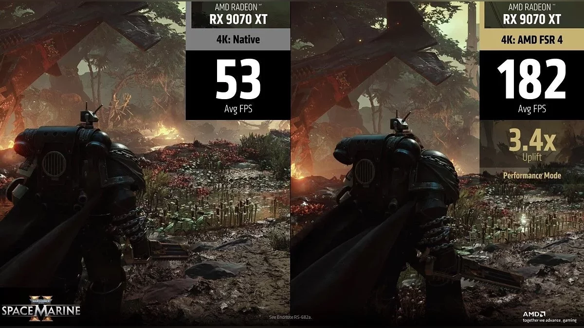 В основе FSR 4 — алгоритмы, обученные на платформах AMD EPYC и Instinct, что обеспечило беспрецедентную точность реконструкции изображения. В демонстрации для прессы на примере Warhammer 40,000: Space Marine 2 инженеры показали, как Performance-режим FSR 4 не только устранил «размытость» шпилей башен, характерную для FSR 3.1, но и превзошел детализацию рендеринга в родном 4K. Технология минимизирует артефакты движения, такие как шлейфы и искажения, сохраняя резкость как в статике, так и в динамике.