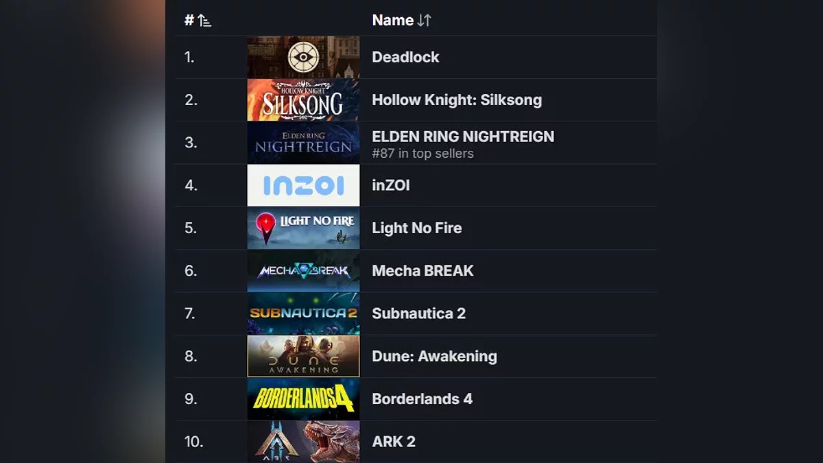 На второе место поднялась метроидвания Hollow Knight: Silksong, а Elden Ring Nightreign оказалась на третьей позиции. Выживалка Ark 2 опустилась на десятое место, а сетевой шутер Mecha BREAK поднялся на шестое. MMO-выживалки Dune: Awakening вошла в ТОП-10, оказавшись на 8 позиции.