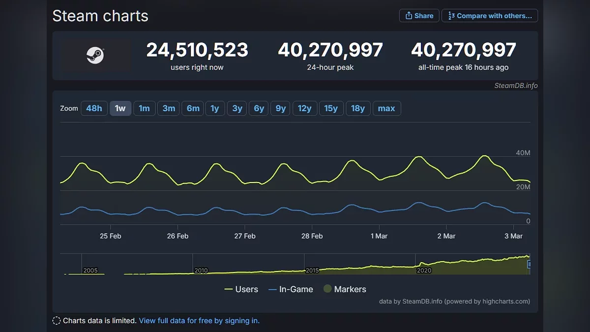 Steam снова обновила рекордный онлайн! По данным сервиса SteamDB, прошлым вечером в сервисе Valve находилось более 40 миллионов человек.