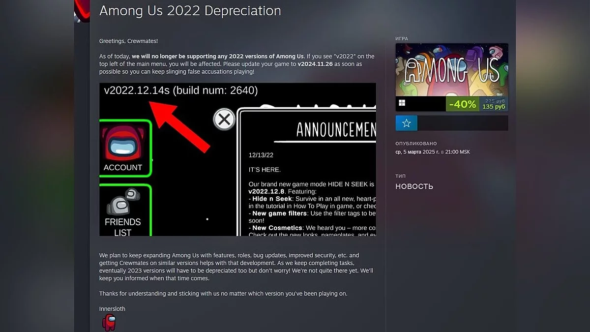 Разработчики Among Us объявили о важных изменениях в поддержке игры, которые могут существенно повлиять на игровой опыт пользователей. С 5 марта 2025 года полностью прекращается поддержка всех версий игры, выпущенных в 2022 году и ранее. Это означает, что игроки, использующие версии с префиксом «v2022» в главном меню, столкнутся с серьёзными ограничениями в игровом процессе.