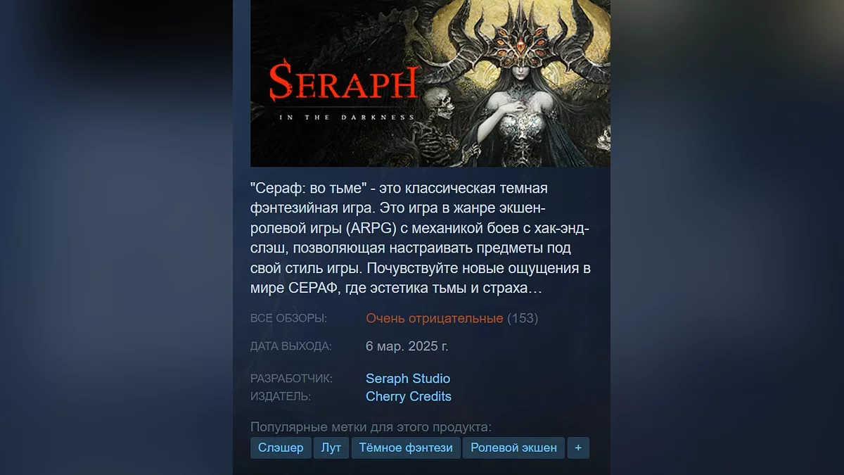 Пользователи Steam раскритиковали SERAPH: In the Darkness. Игра получила 16% рейтинга. В отзывах её называют плохой копией Diablo и ругают за низкое качество, донат, ИИ-катсцены и и проблему с регистрацией. Некоторые геймеры сравнивают проект с браузерными играми.