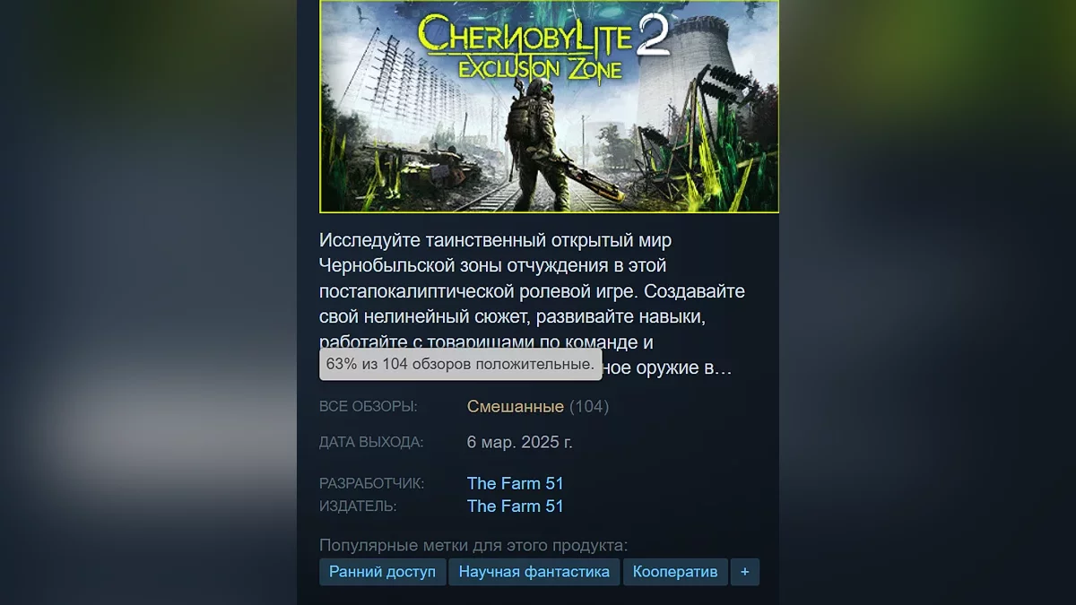6 марта в раннем доступе Steam состоялся релиз постапокалиптического шутера с открытым миром Chernobylite 2: Exclusion Zone. Игроки сыграли в сиквел и поделились своим мнением о проекте.