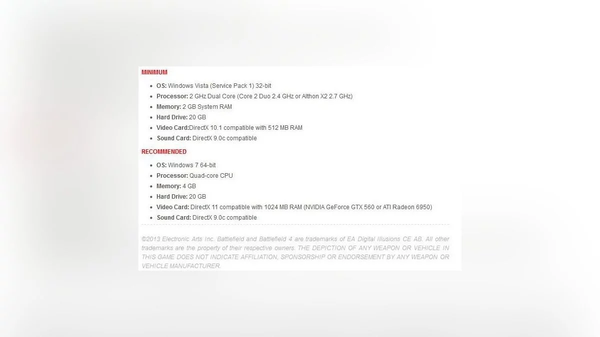 А затем один из представителей Electronic Arts высказался по этому поводу следующим образом: «Я не верю, что окончательные системные требования уже решены, а все, что мы видели сегодня, до боли напоминает требования из BF3 лишь с парочкой поправок. Я понимаю, что все огорошены этими новостями, но я бы не стал доверять этим системным требованиям».