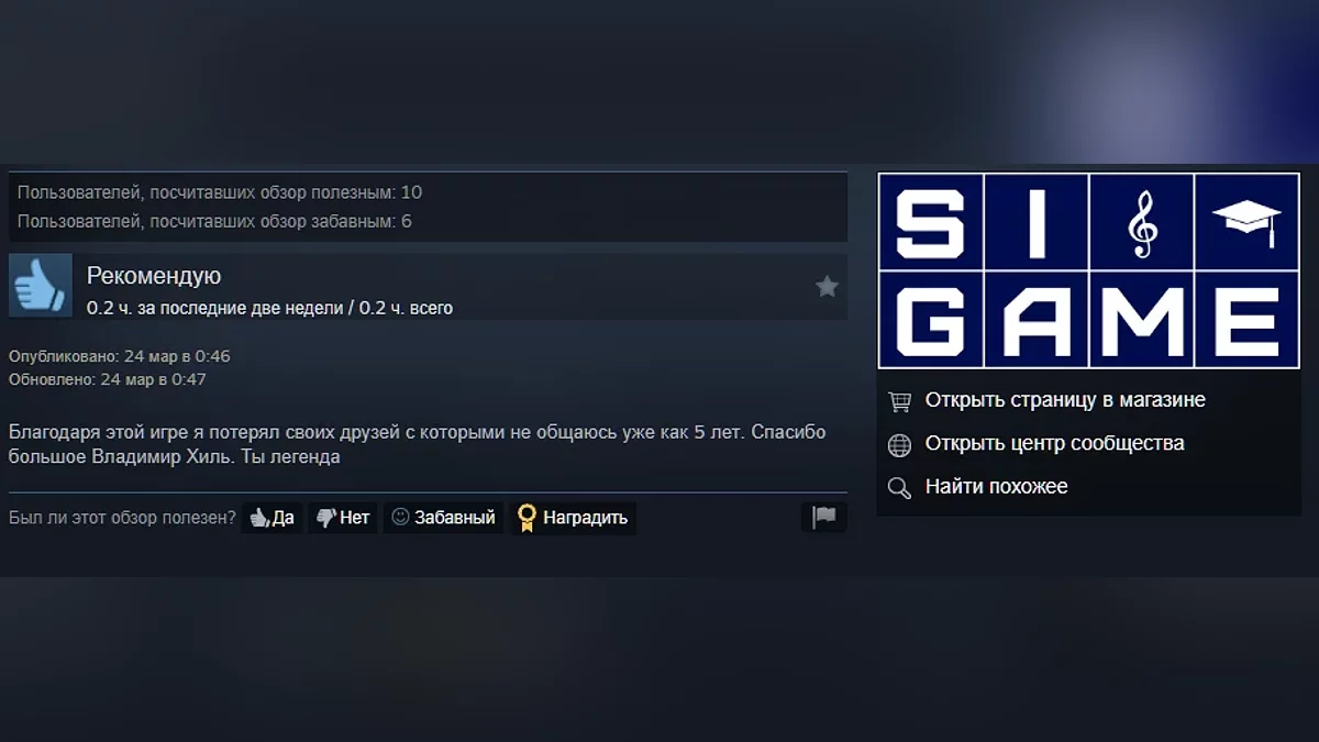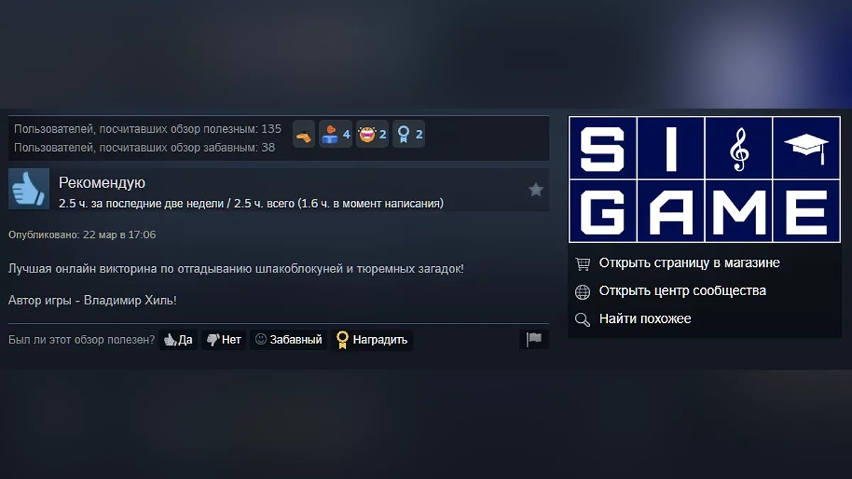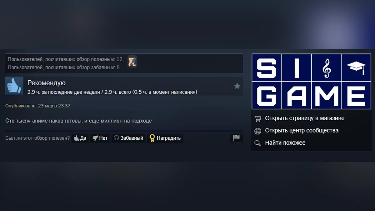Steam-версия уже получила 109 отзывов с рейтингом 91%. Если вы уже играли в «Свою игру», то вряд ли удивитесь комментариям — они почти целиком посвящены создателю викторины и вопросам про аниме.