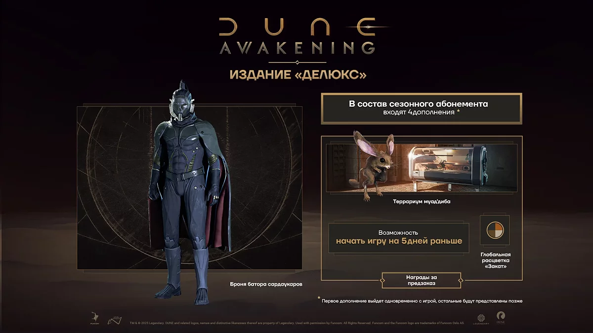 Игроки из России могут заранее приобрести в сервисе Valve три издания на выбор. Предзаказ базовой версии Dune: Awakening обойдётся в 2 990 рублей, Deluxe Edition с ранним доступом на пять дней, сезонным абонементом и бронёй сардаукаров стоит 4 090 рублей, а Ultimate Edition со всем вышеперечисленным, цифровым артбуком, строительным набором и другими бонусами можно приобрести за 5 190 рублей. За предзаказ любого из изданий игроки получат террариум муад'диба и расцветку «Закат».