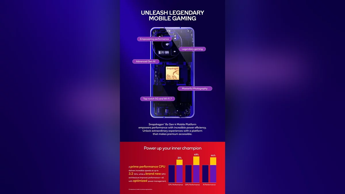 Вопреки ожиданиям, Snapdragon 8s Gen 4 изготовлен по 4-нм норм TSMC, а не по более современному 3-нм процессу, как его старший брат. Однако это не помешало Qualcomm добиться впечатляющих результатов: 8-ядерная архитектура с конфигурацией 1+3+2+2 (частота до 3.2 ГГц) обеспечивает прирост скорости CPU на 31% по сравнению с Gen 3, а графика демонстрирует скачок на 49% благодаря обновленному GPU. При этом энергопотребление снижено на 39%, что особенно важно для игровых сессий и длительной работы.