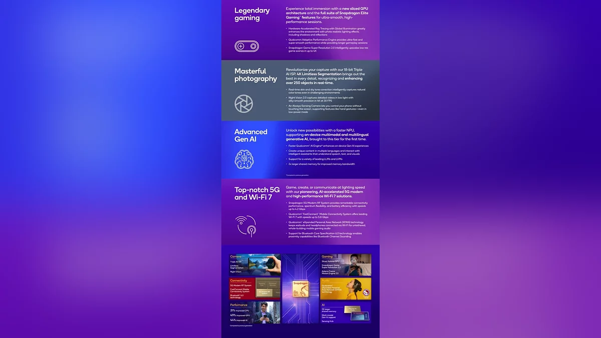 Нейропроцессор нового поколения ускоряет выполнение задач с искусственным интеллектом на 44%, что открывает возможности для продвинутой обработки фото, умных ассистентов и генеративного ИИ прямо на устройстве. Snapdragon 8s Gen 4 также поддерживает камеры до 320 Мп и запись видео в 4K HDR@60 кадров/с, что станет подарком для мобильных фотографов. Несмотря на отсутствие mmWave 5G (технология актуальна лишь для части рынка), чип получил Wi-Fi 7 и Bluetooth 6.0 для сверхбыстрой передачи данных, а также совместимость с LPDDR5X-памятью (4800 МГц) и накопителями UFS 4.0.