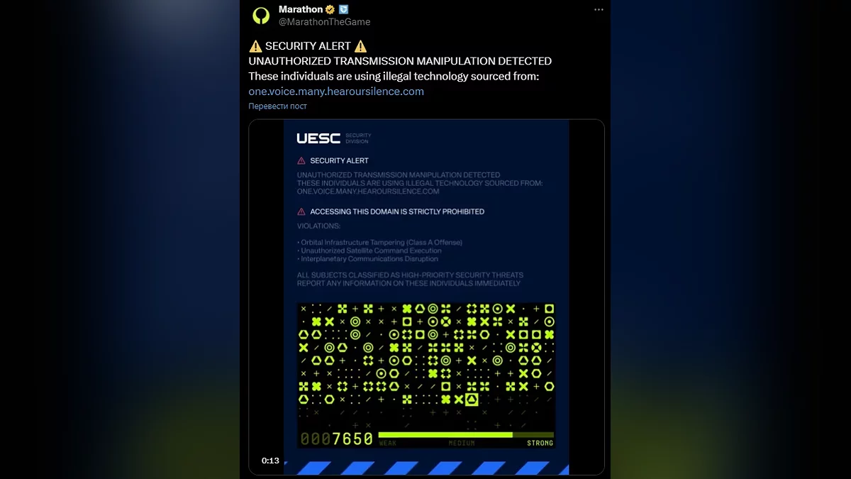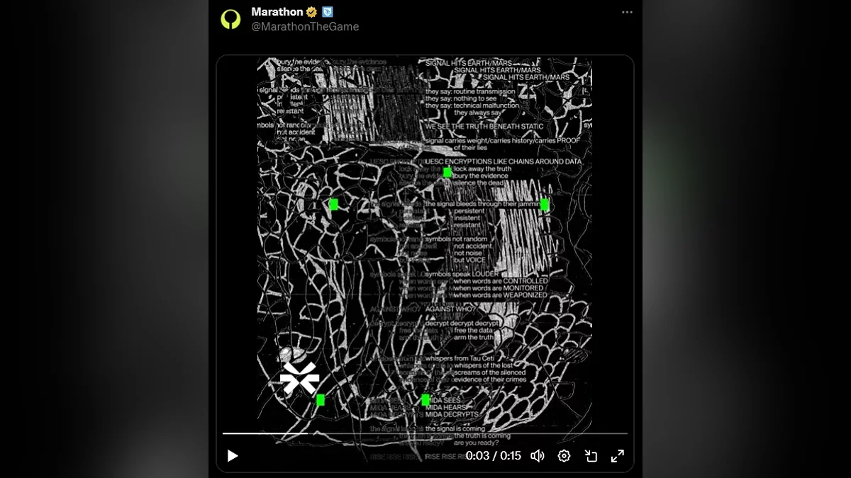 Sony начала мощно тизерить грядущий показ Marathon, следующей сервисной игры от Bungie. Разработчики запустили ARG (игру в альтернативной реальности), показав несколько изображений в виде помех и зашифрованных символов. Тизеры появились в соцсетях Bungie и PlayStation, а также на странице Marathon в Steam.
