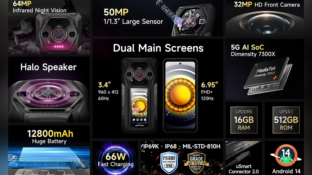 Аппарат оснащен процессором Dimensity 7300X, адаптированным под два экрана, 16 ГБ оперативной памяти и 512 ГБ встроенного хранилища. Для съемки в темноте предусмотрена 64-Мп камера с инфракрасными светодиодами и алгоритмом NightElf 3.0, который фиксирует объекты, невидимые при обычной ночной съемке. Основной модуль на 50 Мп дополнен сверхширокоугольным датчиком.
