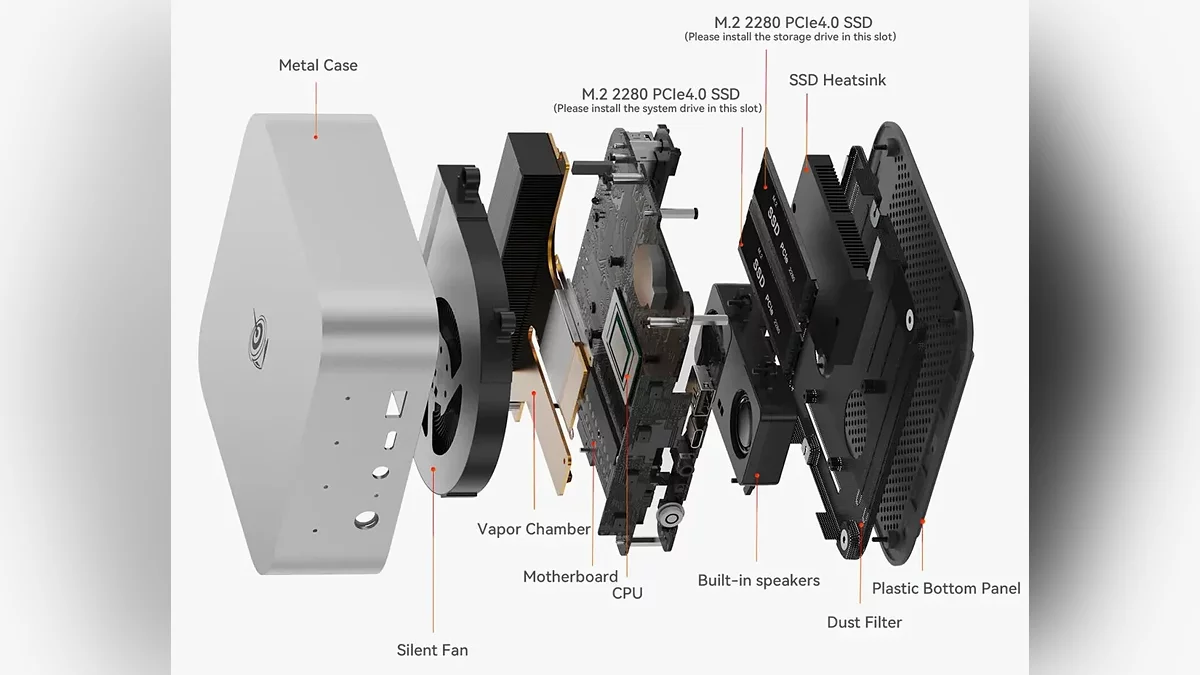 SEi13 Pro выделяется системой охлаждения MSC 2.0: воздухозаборник снизу корпуса и металлический пылевой фильтр обеспечивают тихую работу (до 32 дБ) даже под нагрузкой. В конфигурации по умолчанию устройство оснащено 32 ГБ двухканальной памяти LPDDR5 и SSD на 1 ТБ, но пользователи могут расширить хранилище до 8 ТБ через два слота NVMe.