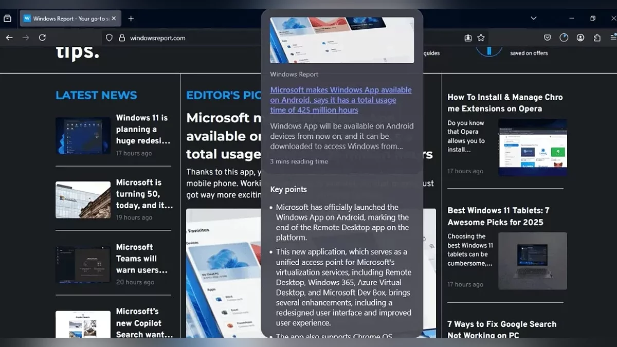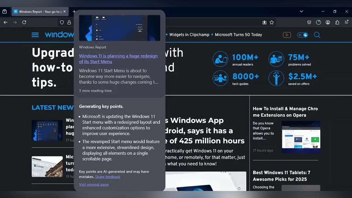 По данным разработчиков, ИИ обрабатывает контент страницы и генерирует сводку, но система предупреждает о возможных неточностях, рекомендуя обращаться к исходному материалу. Задержка между наведением и появлением подсказки составляет несколько секунд — это связано с процессом обработки данных. Панель с информацией можно закрыть клавишей ESC или кликом за её пределами.