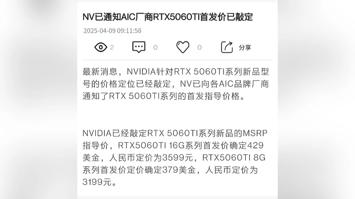 Ориентировочные цены на новые графические ускорители GeForce RTX 5060 Ti стали известны благодаря данным, полученным китайскими партнерами NVIDIA. Согласно внутренним источникам, базовая модель с 8 ГБ памяти будет оценена в 3199 юаней (около $450 или 39 000 рублей), а версия с 16ГБ — в 3599 юаней (около $500 или 43 000 рублей). Официальный старт продаж запланирован на следующую неделю.