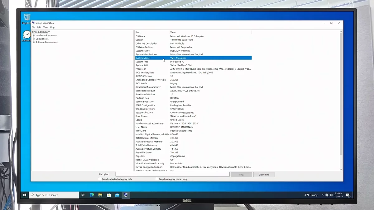 Корпус компьютера выполнен в минималистичном дизайне, напоминающем гибрид PC и игровой консоли. Наличие порта VirtualLink USB-C намекает, что прототип мог использоваться для проверки работы с VR-устройствами до того, как этот стандарт потерял актуальность. При загрузке система сначала отображает логотип Steam, а затем переходит к интерфейсу Windows, что указывает на кастомизированную версию ПО.