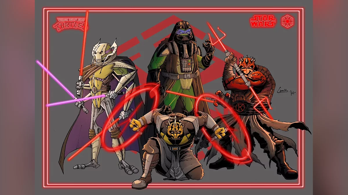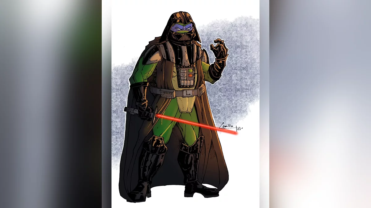Ранее он изобразил Черепашек-ниндзя в виде персонажей Marvel, а теперь перенёс героев во вселенную «Звёздных войн». На иллюстрациях художника Микеланджело стал Саважем Опрессом, Леонардо — Дарт Вейдером, Рафаэль — Дарт Молом, а Донателло — Генералом Гривусом.