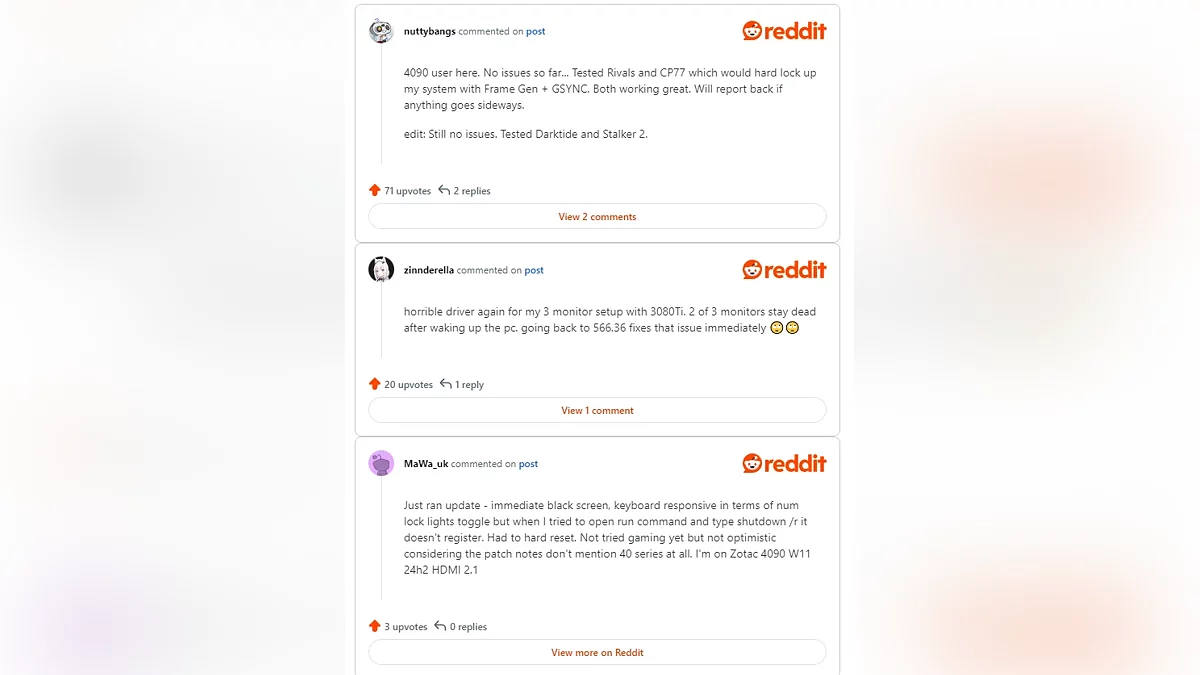 По данным из открытых обсуждений, обновление действительно помогло некоторым владельцам флагманских моделей. Например, пользователь RTX 4090 отметил, что зависания в Cyberpunk 2077 исчезли после установки драйвера. Тем не менее, другие сообщают о противоположном эффекте: на форумах описывают случаи, когда система перестаёт реагировать на команды после обновления, требуя перезагрузки. Владелец RTX 3080 Ti пожаловался, что два из трёх мониторов перестали отображать изображение, а переход на предыдущую версию ПО 566.36 временно решил проблему.
