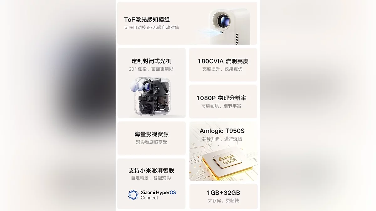 Особенность модели — автоматическая настройка. Лазерный датчик ToF корректирует фокус и геометрию изображения на 20% и 13% быстрее предыдущей версии, что позволяет начать просмотр сразу после включения. Обновлённая система охлаждения снизила уровень шума до 2 дБ, делая устройство практически бесшумным. В основе проектора — процессор Amlogic T950S с четырьмя ядрами (1,5 ГГц), 1 ГБ оперативной памяти и 32 ГБ встроенного хранилища.