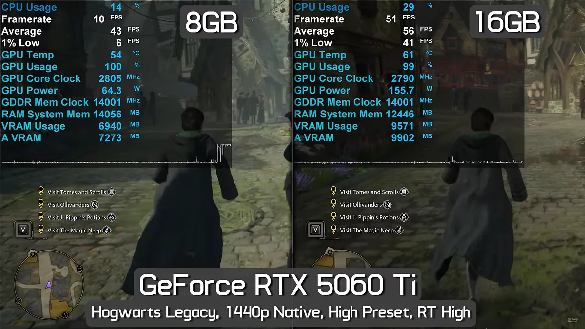 В таких играх, как The Last of Us Part II и Horizon Forbidden West, разрыв между версиями достигал 30–80% в разрешении 1440p и 4K. Например, при активации трассировки лучей в Hogwarts Legacy карта с 8 ГБ демонстрировала падение производительности почти в пять раз по сравнению со старшей моделью. Даже в менее требовательных сценариях, возникали резкие просадки до 7 кадров в секунду и вылеты из-за нехватки памяти.