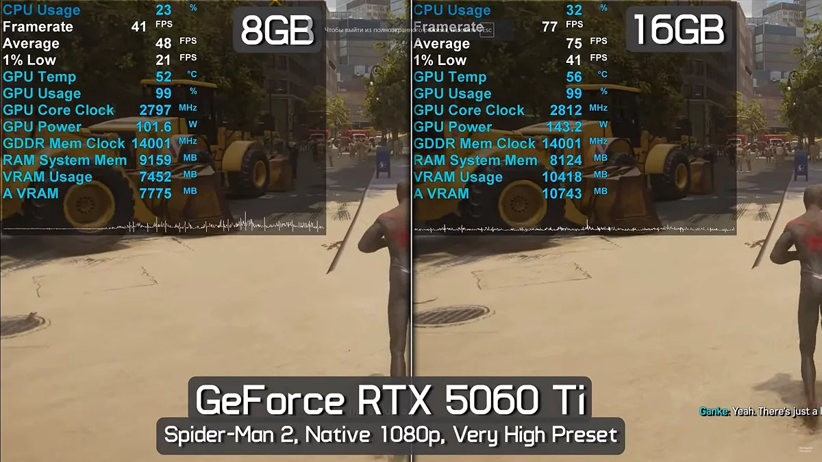 Примечательно, что в синтетических тестах (3DMark) обе версии показали схожие результаты, однако в реальных игровых условиях 8 ГБ VRAM оказалось недостаточно. В Cyberpunk 2077 и Spider-Man 2 младшая модель не справлялась с загрузкой текстур, а включение DLSS лишь частично нивелировало проблему. Исключением стали God of War: Ragnarok и Alan Wake 2, где разница была минимальной.