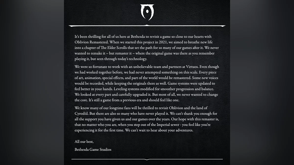 Мы знаем, что для многих наших давних фанатов возвращение в Oblivion и земли Сиродила будет настоящим удовольствием. Но есть и те, кто никогда раньше не играл в неё. Мы бесконечно благодарны за всю поддержку, которую вы оказывали нам и нашим играм на протяжении всех этих лет. Мы надеемся, что кем бы вы ни были, ваш первый выход из Имперской канализации ощущался как новое приключение. Мы с нетерпением ждём ваших историй.