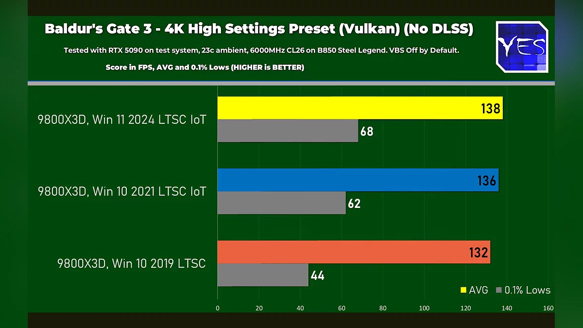 Однако в Kingdom Come: Deliverance II и Baldur's Gate 3 преимущество перешло к Windows 11 LTSC. Особенно заметной разница стала в 4K, где новая ОС стабильно выдавала на несколько кадров больше.