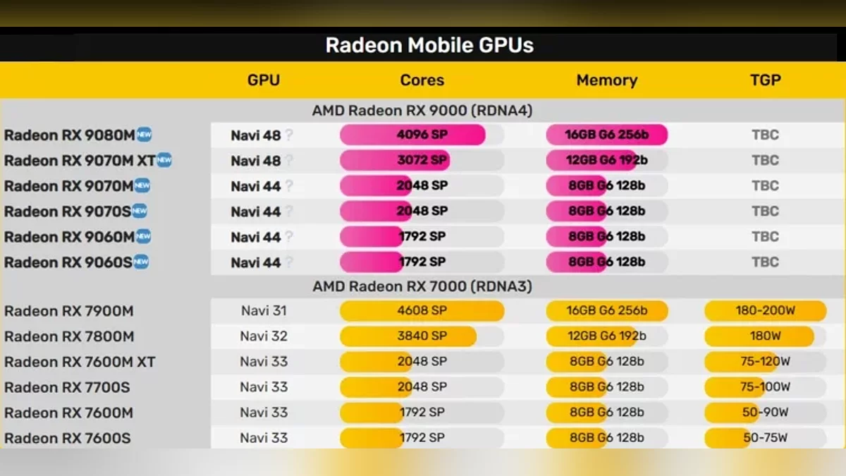 Согласно информации инсайдеров, флагманом серии станет RX 9080M, построенная на архитектуре RDNA4 с 64 вычислительными блоками, что эквивалентно 4 096 потоковым процессорам. Эта видеокарта получит 16 Гб видеопамяти и станет самой производительной в линейке. Следом идёт RX 9070M XT, оснащённая 48 CU и 12 Гб памяти, что делает её мобильным аналогом недавно представленной RX 9070 GRE. Другие ожидаемые модели включают RX 9070M, 9070S, 9060M и 9060S, с количеством ядер от 2 048 до 1 792 и объёмом видеопамяти от 8 Гб.